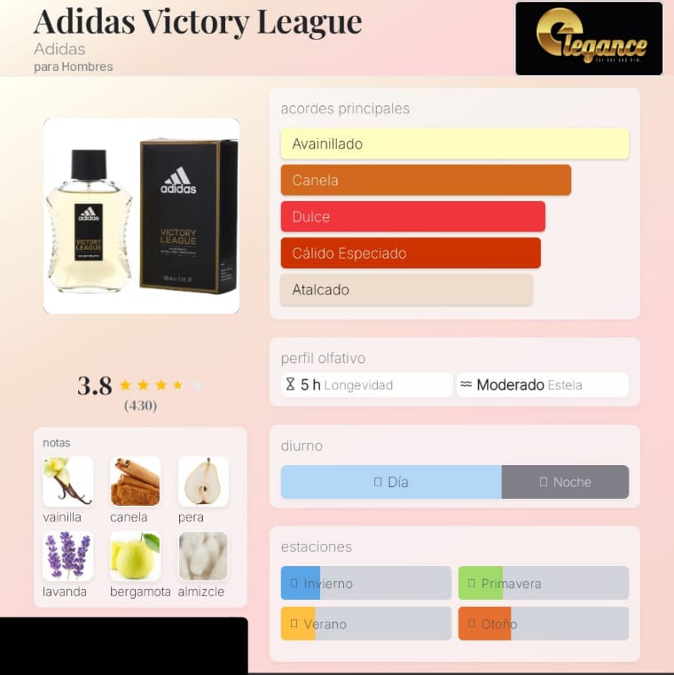 Adidas Victory League de Adidas es una fragancia de la familia olfativa Oriental Amaderada para Hombres. Adidas Victory League se lanzó en 2006.