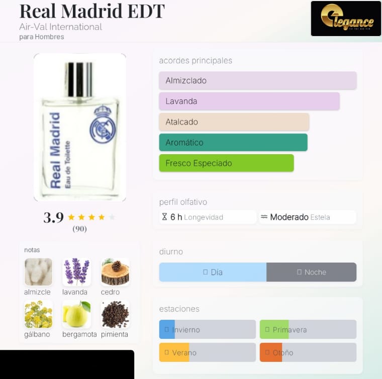 Real Madrid EDT de Air-Val International es una fragancia de la familia olfativa para Hombres. Las Notas de Salida son gálbano y bergamota; las Notas de Corazón son lavanda y pimienta; las Notas de Fondo son almizcle y cedro.
