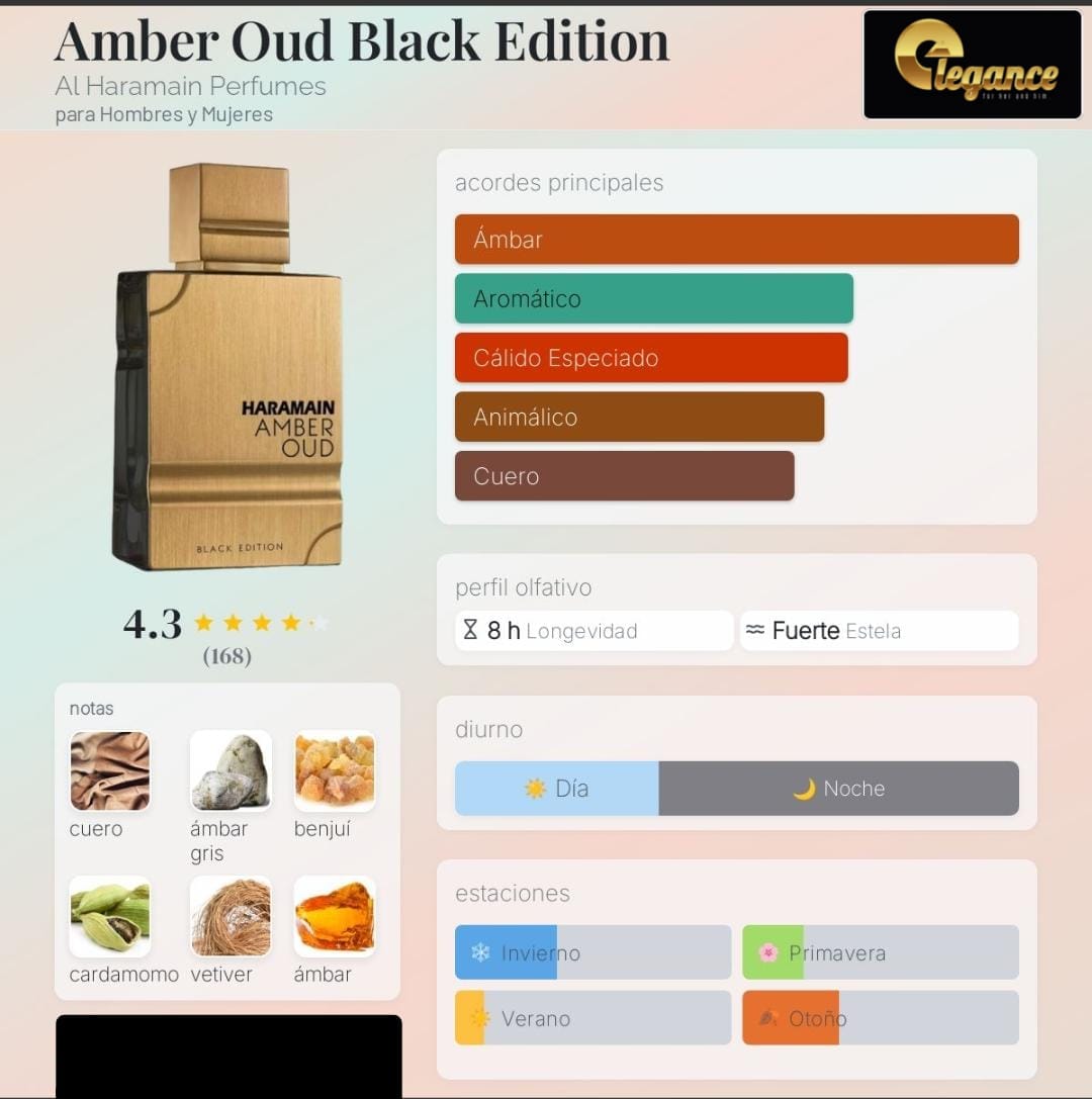 Amber Oud Black Edition de Al Haramain Perfumes es una fragancia de la familia olfativa Oriental Amaderada para Hombres y Mujeres. Esta fragrancia es nueva. Amber Oud Black Edition se lanzó en 2023. Las Notas de Salida son cardamomo, lavanda y notas amaderadas; las Notas de Corazón son cuero, ámbar y haba tonka; las Notas de Fondo son vetiver, ámbar gris y benjuí.