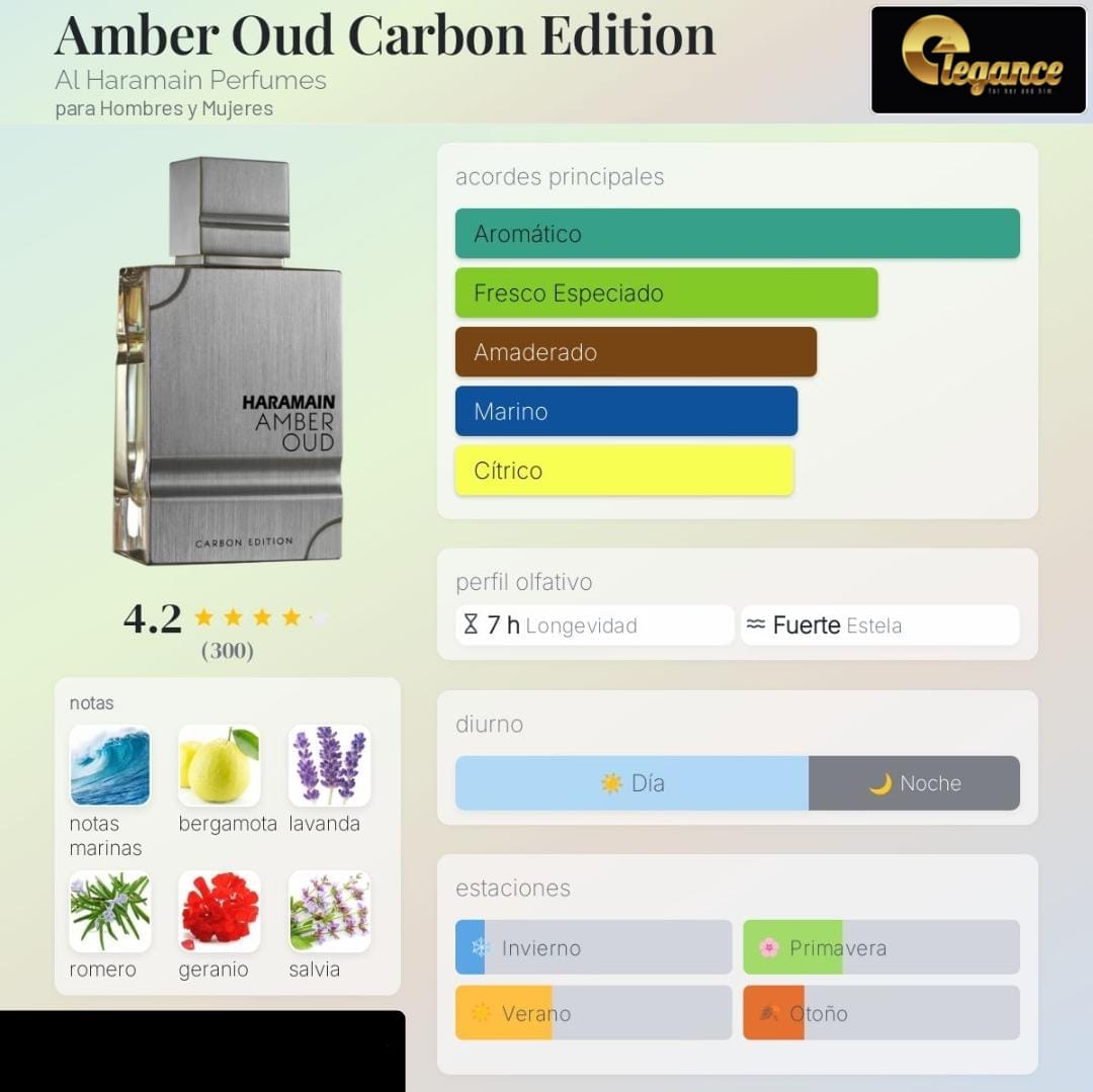 Amber Oud Carbon Edition de Al Haramain Perfumes es una fragancia de la familia olfativa Amaderada Aromática para Hombres y Mujeres. Esta fragrancia es nueva. Amber Oud Carbon Edition se lanzó en 2022. Las Notas de Salida son bergamota, lavanda y romero; las Notas de Corazón son notas marinas, geranio y salvia; las Notas de Fondo son ámbar, musgo, vetiver y cedro.