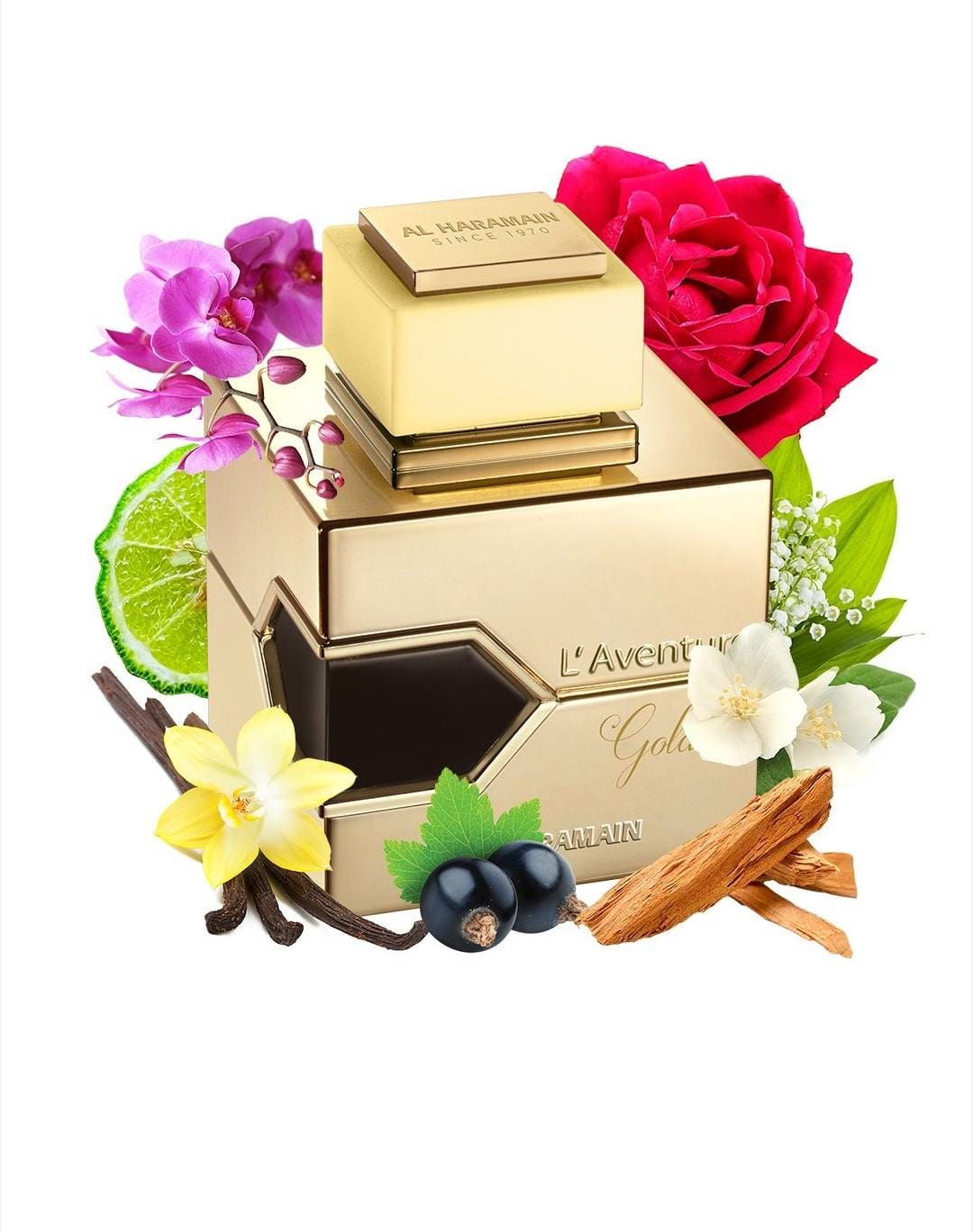 L’Aventure Gold de Al Haramain Perfumes es una fragancia de la familia olfativa Almizcle Floral Amaderado para Mujeres. Esta fragrancia es nueva. L’Aventure Gold se lanzó en 2022. Las Notas de Salida son bergamota, hojas verdes y grosellas negras; las Notas de Corazón son lirio de los valles (muguete), ciruela, orquídea, jazmín y rosa; las Notas de Fondo son almizcle, sándalo y vainilla.