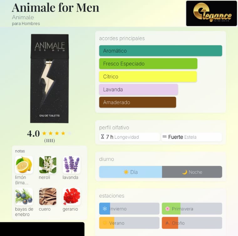 Animale for Men de Animale es una fragancia de la familia olfativa Oriental Especiada para Hombres. Animale for Men se lanzó en 1993. Las Notas de Salida son limón (lima ácida), neroli y fresia; las Notas de Corazón son lavanda, bayas de enebro y geranio; las Notas de Fondo son cuero, musgo de roble y vetiver.