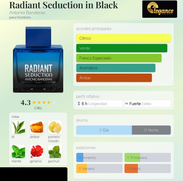 Radiant Seduction in Black de Antonio Banderas es una fragancia de la familia olfativa Aromática para Hombres. Radiant Seduction in Black se lanzó en 2016. Las Notas de Salida son toronja (pomelo), menta, lima (limón verde) y mandarina; las Notas de Corazón son té negro y geranio; las Notas de Fondo son ámbar, pachulí y cedro.