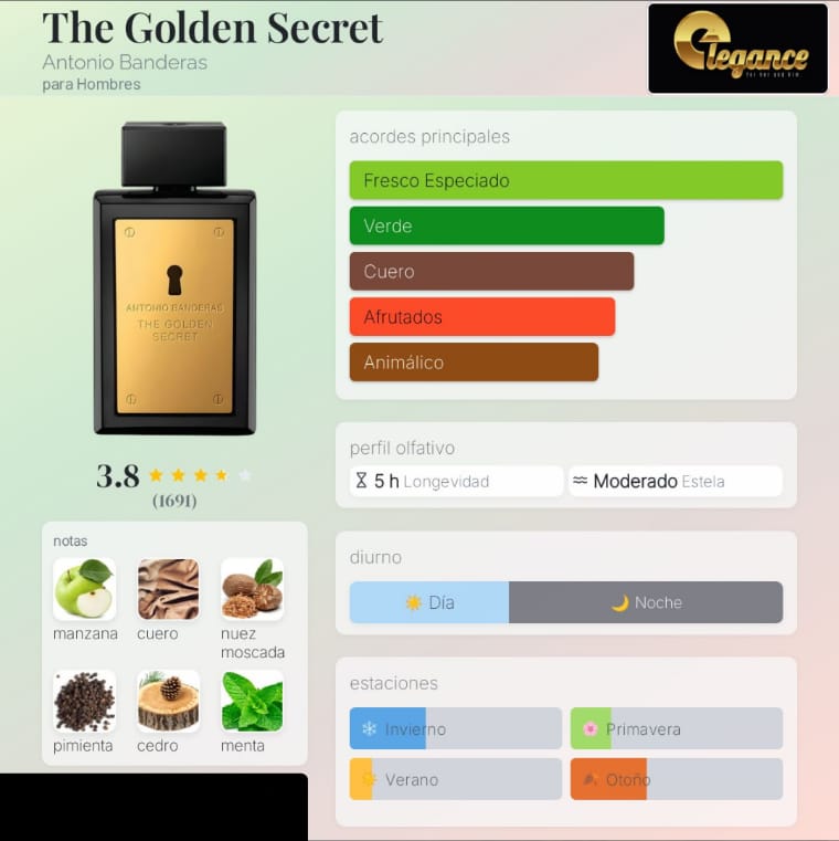 The Golden Secret de Antonio Banderas es una fragancia de la familia olfativa Aromática Especiada para Hombres. The Golden Secret se lanzó en 2011. La Nariz detrás de esta fragrancia es Christophe Raynaud. Las Notas de Salida son manzana, menta y notas verdes; las Notas de Corazón son nuez moscada, pimienta y comino; las Notas de Fondo son cuero, cedro y almizcle.