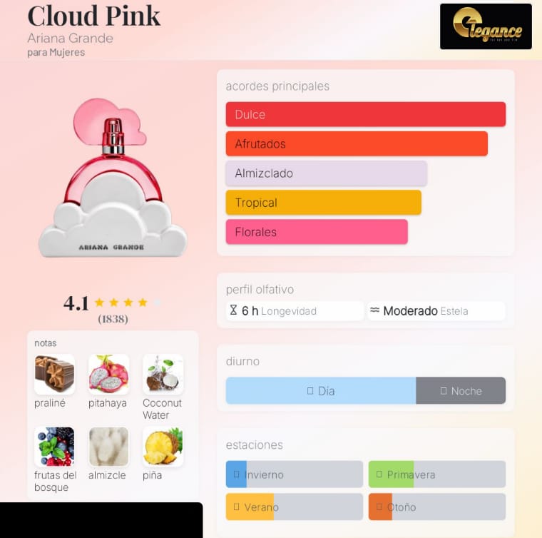 Cloud Pink de Ariana Grande es una fragancia de la familia olfativa Oriental Vainilla para Mujeres. Esta fragrancia es nueva. Cloud Pink se lanzó en 2023. La Nariz detrás de esta fragrancia es Clement Gavarry. Las Notas de Salida son pitahaya, bayas silvestres y piña; las Notas de Corazón son Agua de coco, orquídea de vainilla y almizcle ambreta; las Notas de Fondo son praliné, almizcle, Amberwood y musgo.