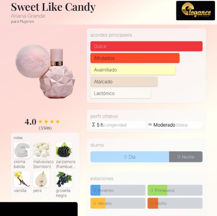 Sweet Like Candy de Ariana Grande es una fragancia de la familia olfativa Floral Frutal Gourmand para Mujeres. Sweet Like Candy se lanzó en 2016. Las Notas de Salida son zarzamora (frambuesa negra), pera y bergamota; las Notas de Corazón son crema batida, malvavisco (bombón), grosellas negras, jazmín, frangipani (plumeria, plumaria, atapaima) y madreselva; las Notas de Fondo son vainilla y madera de cachemira.