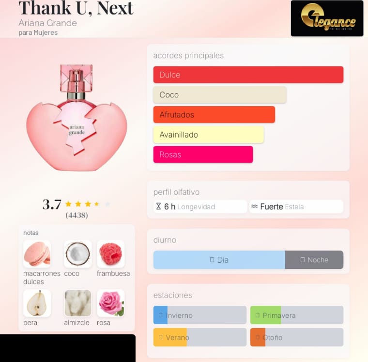 Thank U, Next de Ariana Grande es una fragancia de la familia olfativa Floral Frutal Gourmand para Mujeres. Thank U, Next se lanzó en 2019. La Nariz detrás de esta fragrancia es Jérôme Epinette. Las Notas de Salida son frambuesa y pera; las Notas de Corazón son coco y rosa rosada; las Notas de Fondo son macarrones dulces y almizcle.