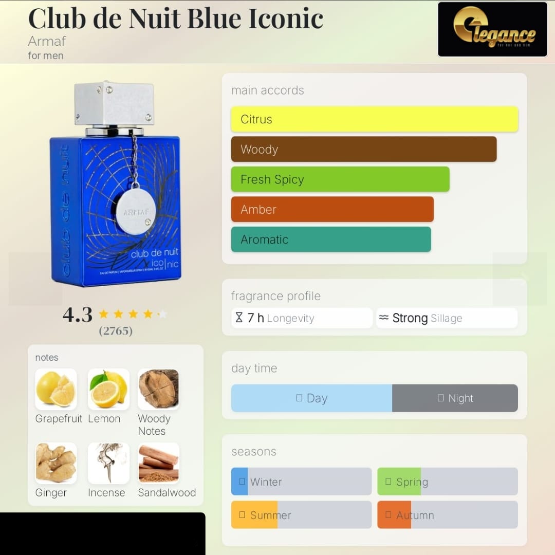 Club de Nuit Blue Iconic by Armaf is a fragrance for men. This is a new fragrance. Club de Nuit Blue Iconic was launched in 2022. Top notes are Grapefruit, Lemon, Mint, Pink Pepper and Coriander; middle notes are Ginger, Melon, Jasmine and Nutmeg; base notes are Woody Notes, Incense, Sandalwood, Amber, Cedar, Patchouli and Labdanum.