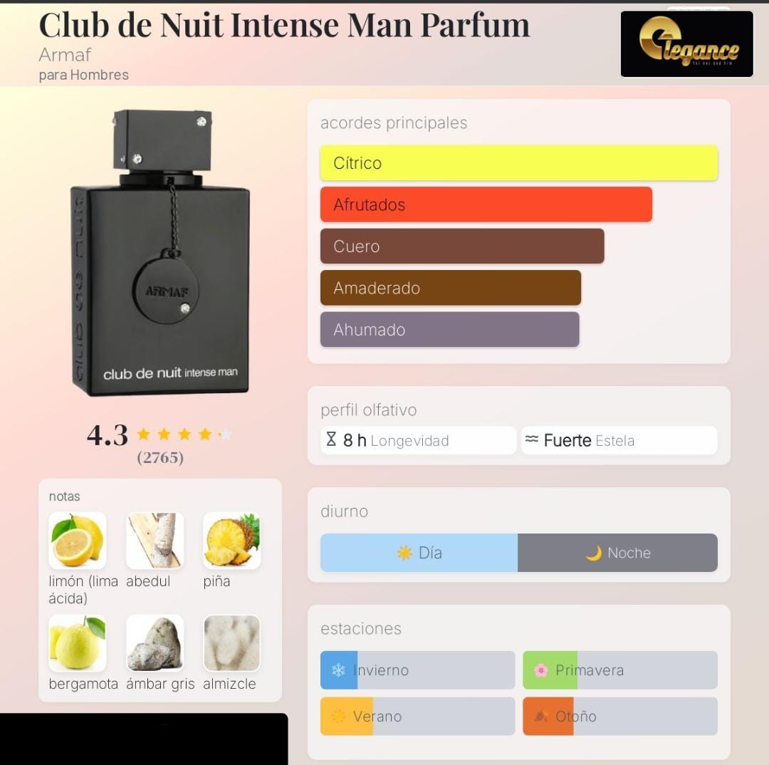 Club de Nuit Intense Man de Armaf es una fragancia de la familia olfativa Amaderada Especiada para Hombres. Club de Nuit Intense Man se lanzó en 2015. Las Notas de Salida son limón (lima ácida), piña, bergamota, grosellas negras y manzana; las Notas de Corazón son abedul, jazmín y rosa; las Notas de Fondo son almizcle, ámbar gris, pachulí y vainilla.