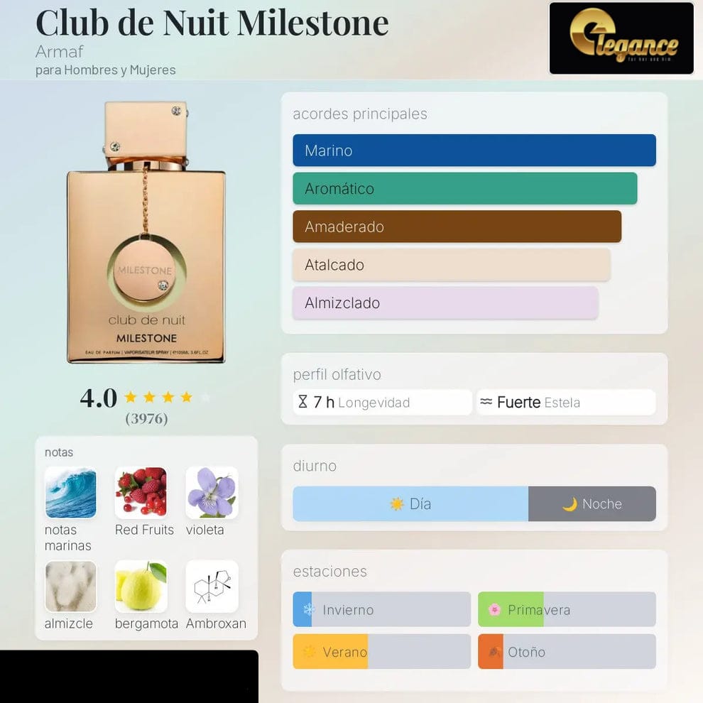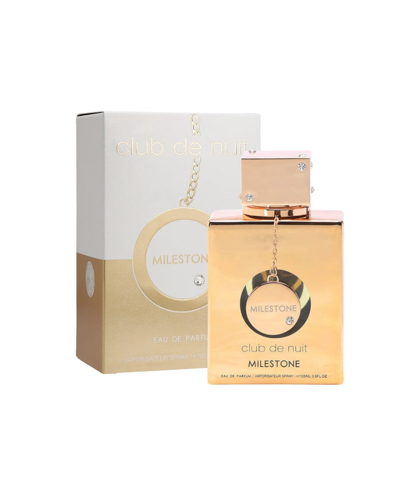 Club de Nuit Milestone de Armaf es una fragancia de la familia olfativa Almizcle Amaderado Floral para Hombres y Mujeres. Club de Nuit Milestone se lanzó en 2019. Las Notas de Salida son notas marinas, Frutas rojas y bergamota; las Notas de Corazón son violeta, maderas blancas y sándalo; las Notas de Fondo son almizcle, ambroxan y vetiver.