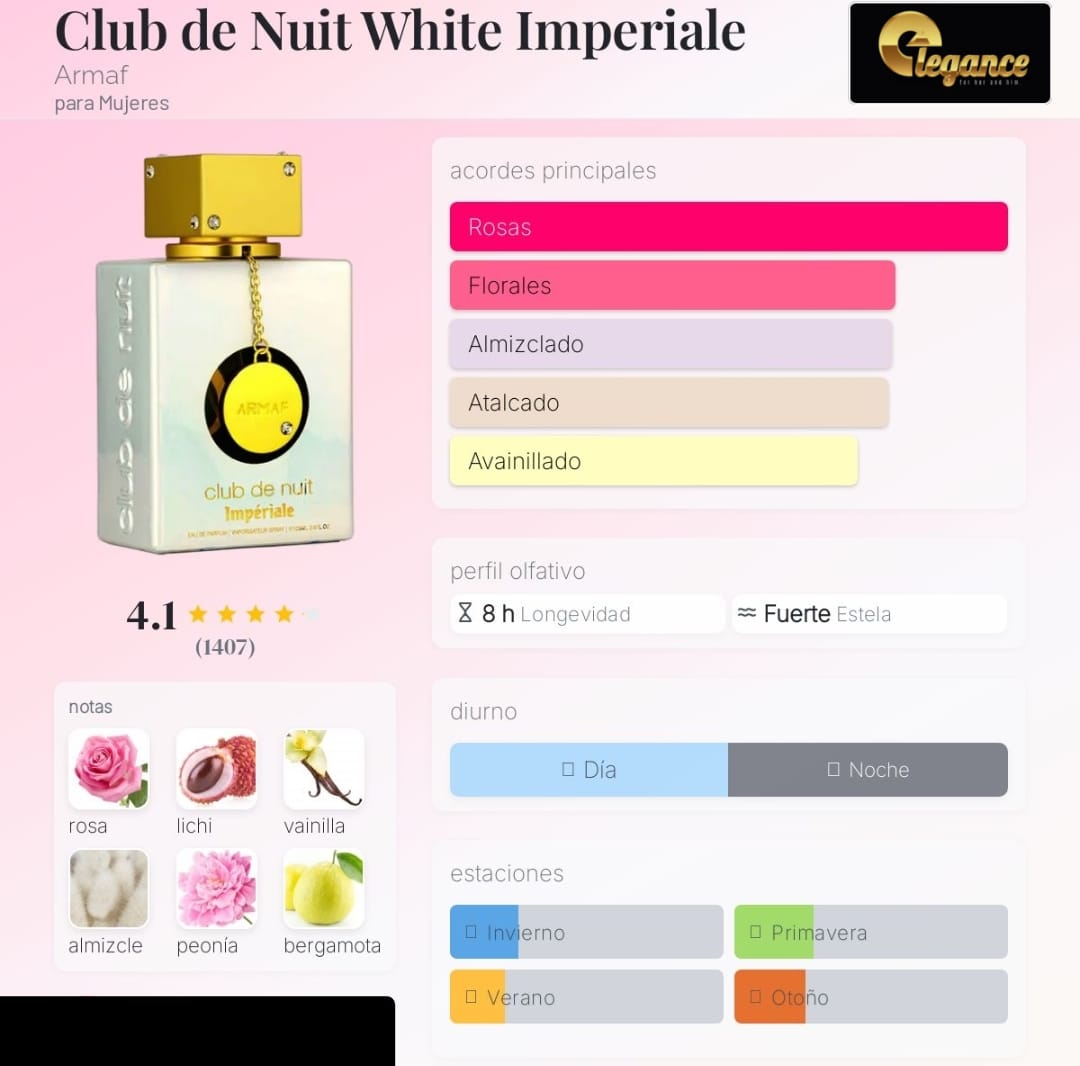 Club de Nuit White Imperiale de Armaf es una fragancia de la familia olfativa para Mujeres. Esta fragrancia es nueva. Club de Nuit White Imperiale se lanzó en 2022. Las Notas de Salida son lichi, bergamota y nuez moscada; las Notas de Corazón son rosa turca, vainilla, almizcle y peonía; las Notas de Fondo son vainilla, incienso, cachemira y cedro.