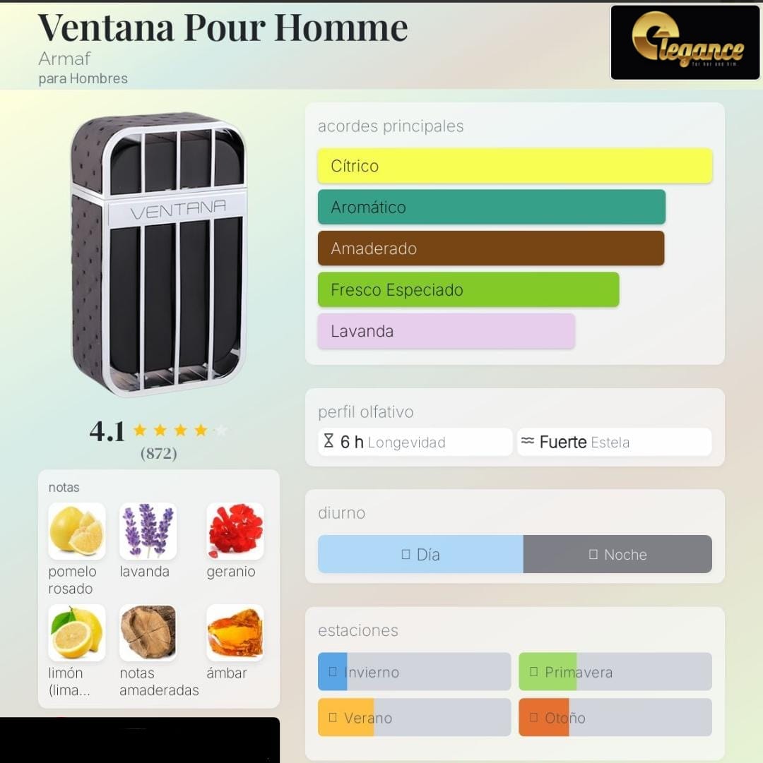 Ventana Pour Homme de Armaf es una fragancia de la familia olfativa Amaderada Aromática para Hombres. Ventana Pour Homme se lanzó en 2017. Las Notas de Salida son toronja (pomelo), limón (lima ácida) y mandarina; las Notas de Corazón son lavanda, geranio, vetiver y pachulí; las Notas de Fondo son maderas preciosas, ámbar y cedro.