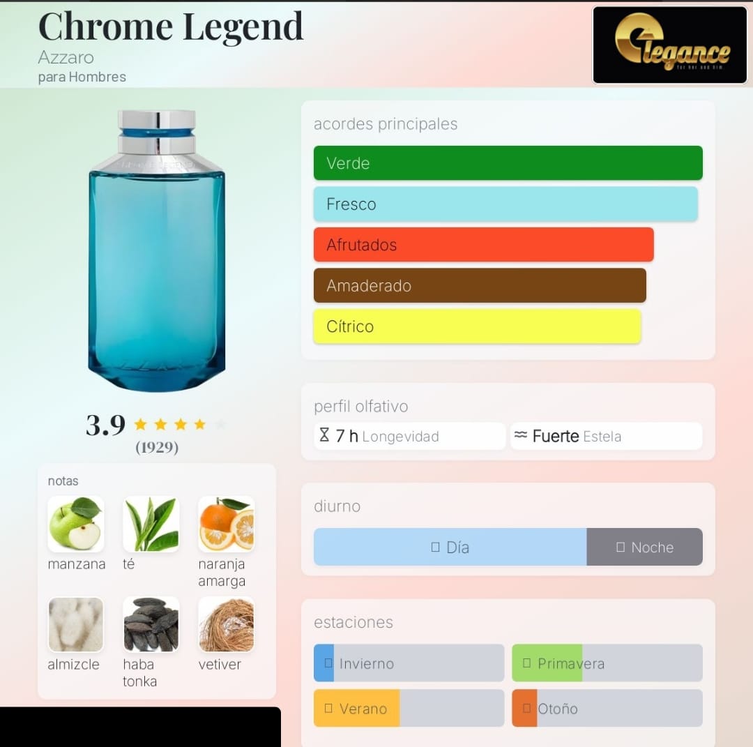 Chrome Legend de Azzaro es una fragancia de la familia olfativa Aromática Frutal para Hombres. Chrome Legend se lanzó en 2007. Chrome Legend fue creada por Christophe Raynaud y Olivier Pescheux.