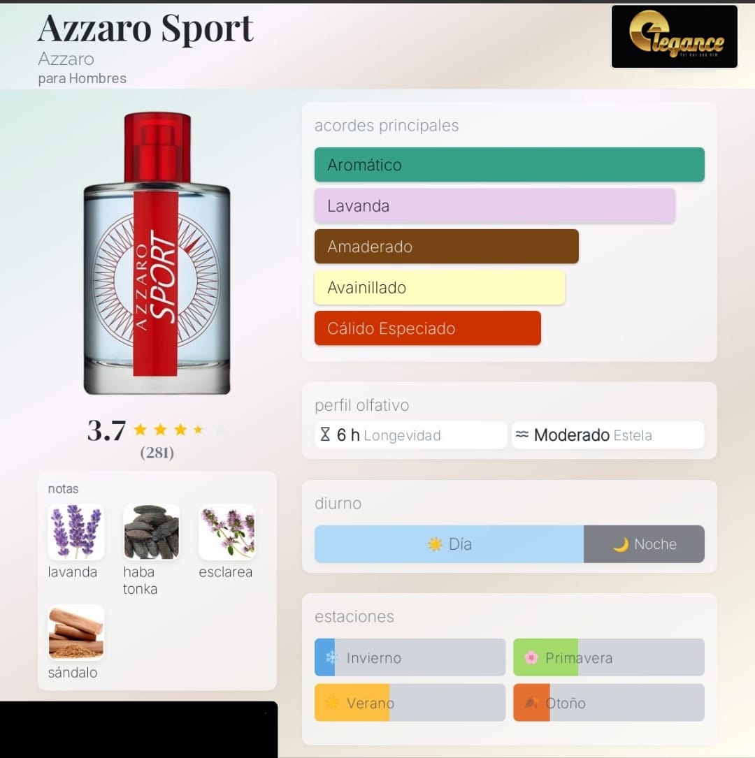 Azzaro Sport de Azzaro es una fragancia de la familia olfativa Oriental Fougère para Hombres. Azzaro Sport se lanzó en 2020. La Nota de Salida es lavanda; la Nota de Corazón es esclarea; las Notas de Fondo son haba tonka y sándalo.