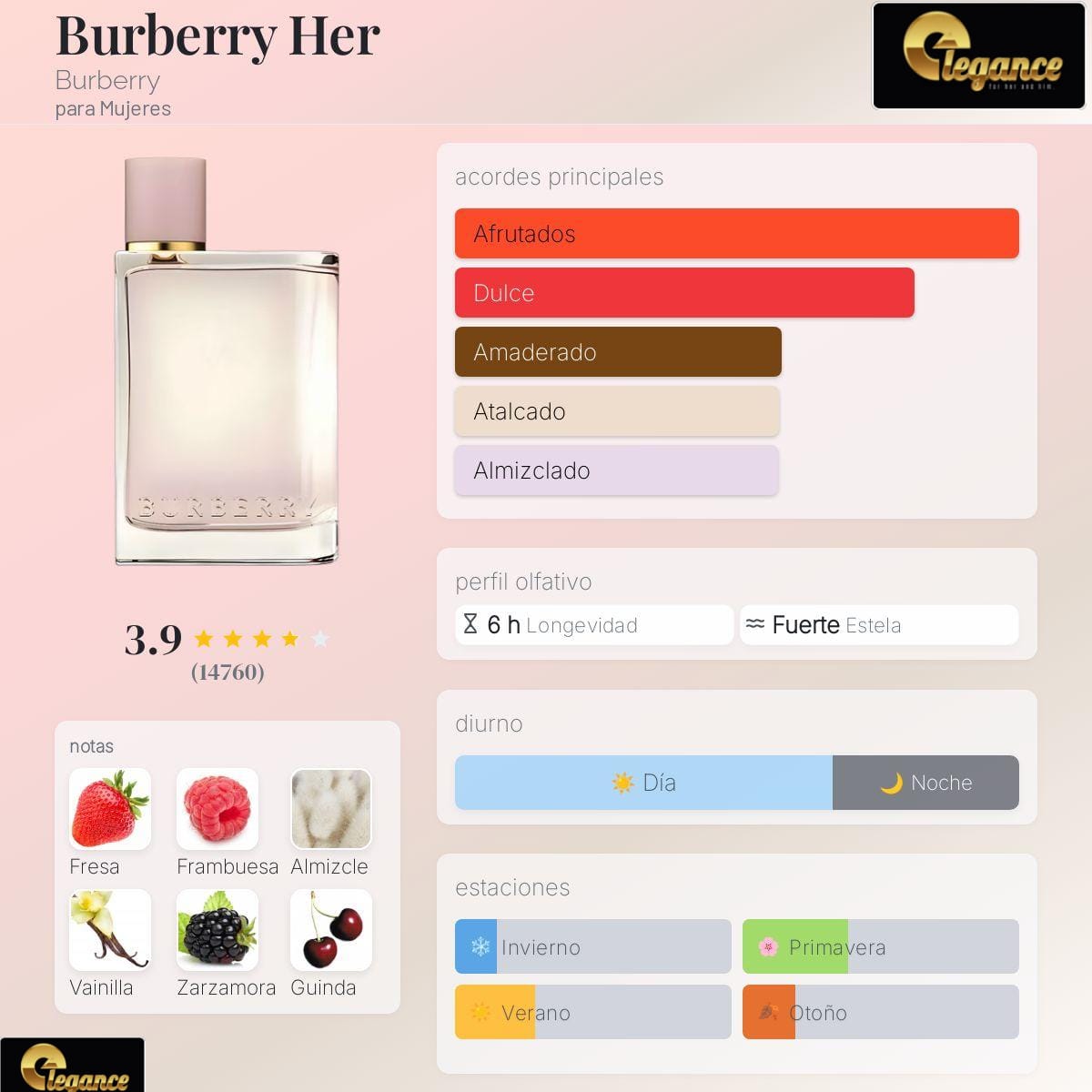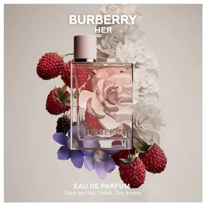 Burberry Her de Burberry es una fragancia de la familia olfativa Floral Frutal Gourmand para Mujeres. Burberry Her se lanzó en 2018. La Nariz detrás de esta fragrancia es Francis Kurkdjian. Las Notas de Salida son fresa, frambuesa, zarzamora (frambuesa negra), cereza ácida (guinda), grosellas negras, mandarina y limón (lima ácida); las Notas de Corazón son violeta y jazmín; las Notas de Fondo son almizcle, vainilla, cachemira, notas amaderadas, ámbar, musgo de roble y pachulí.