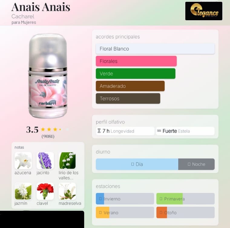 Anais Anais L’Original Eau de Toilette de Cacharel es una fragancia de la familia olfativa Floral para Mujeres. Anais Anais L’Original Eau de Toilette se lanzó en 2014. Las Notas de Salida son jacinto y madreselva; las Notas de Corazón son azucena, lirio de los valles (muguete), jazmín, ylang-ylang y rosa; las Notas de Fondo son musgo, almizcle, vetiver, sándalo y grosellas negras.