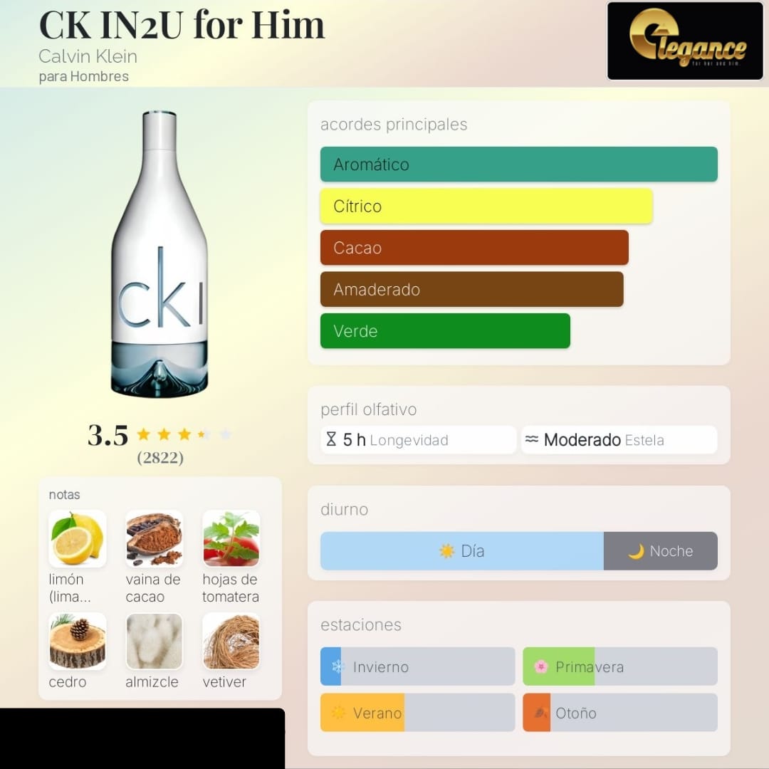 CK IN2U for Him de Calvin Klein es una fragancia de la familia olfativa Aromática Fougère para Hombres. CK IN2U for Him se lanzó en 2007. CK IN2U for Him fue creada por Carlos Benaïm, Bruno Jovanovic, Loc Dong y Jean-Marc Chaillan. Las Notas de Salida son limón (lima ácida) y hojas de tomatera; la Nota de Corazón es vaina de cacao; las Notas de Fondo son cedro, almizcle blanco y vetiver.