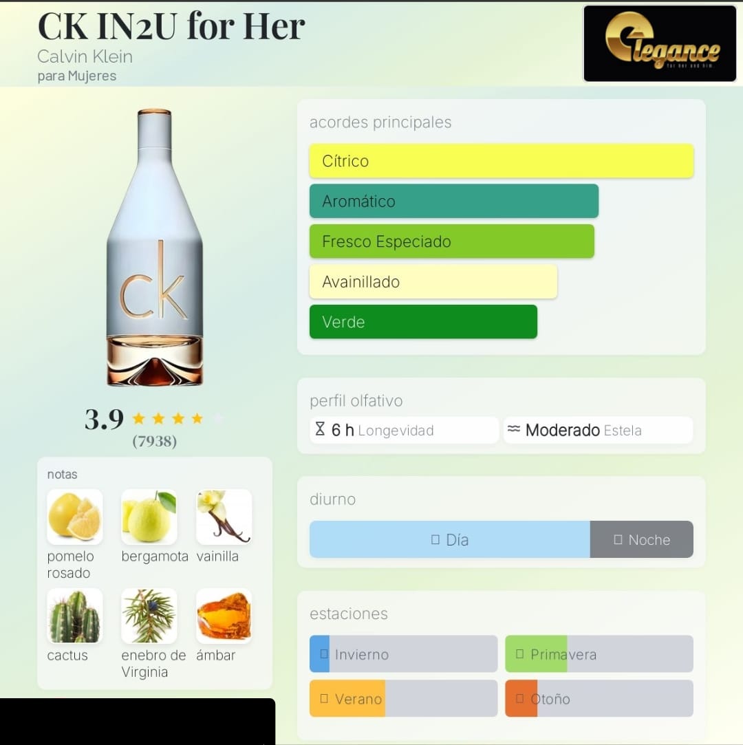 CK IN2U for Her de Calvin Klein es una fragancia de la familia olfativa Oriental Floral para Mujeres. CK IN2U for Her se lanzó en 2007. CK IN2U for Her fue creada por Bruno Jovanovic, Jean-Marc Chaillan, Loc Dong y Carlos Benaïm. Las Notas de Salida son toronja (pomelo) rosada, bergamota de Sicilia y hojas del grosellero rojo; las Notas de Corazón son cactus y orquídea; las Notas de Fondo son vainilla, cedro rojo japonés y ámbar.
