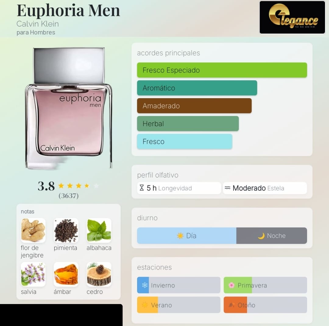 Euphoria Men de Calvin Klein es una fragancia de la familia olfativa Amaderada Aromática para Hombres. Euphoria Men se lanzó en 2006. Euphoria Men fue creada por Carlos Benaïm, Loc Dong y Jean-Marc Chaillan. Las Notas de Salida son jengibre y pimienta; las Notas de Corazón son albahaca negra, salvia y cedro; las Notas de Fondo son ámbar, gamuza, secuoya roja brasileña y pachulí.