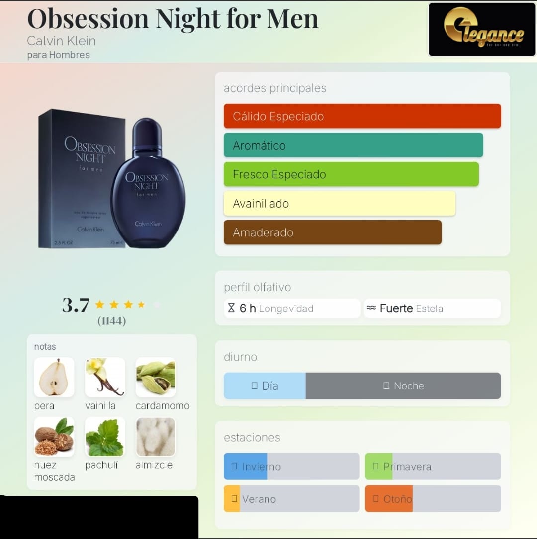 Obsession Night for Men by Calvin Klein is a Oriental Woody fragrance for men. Obsession Night for Men was launched in 2005. Top notes are Pear, Cardamom, Artemisia and Grapefruit; middle notes are Nutmeg and Musk; base notes are Vanilla, Patchouli and Vetiver.