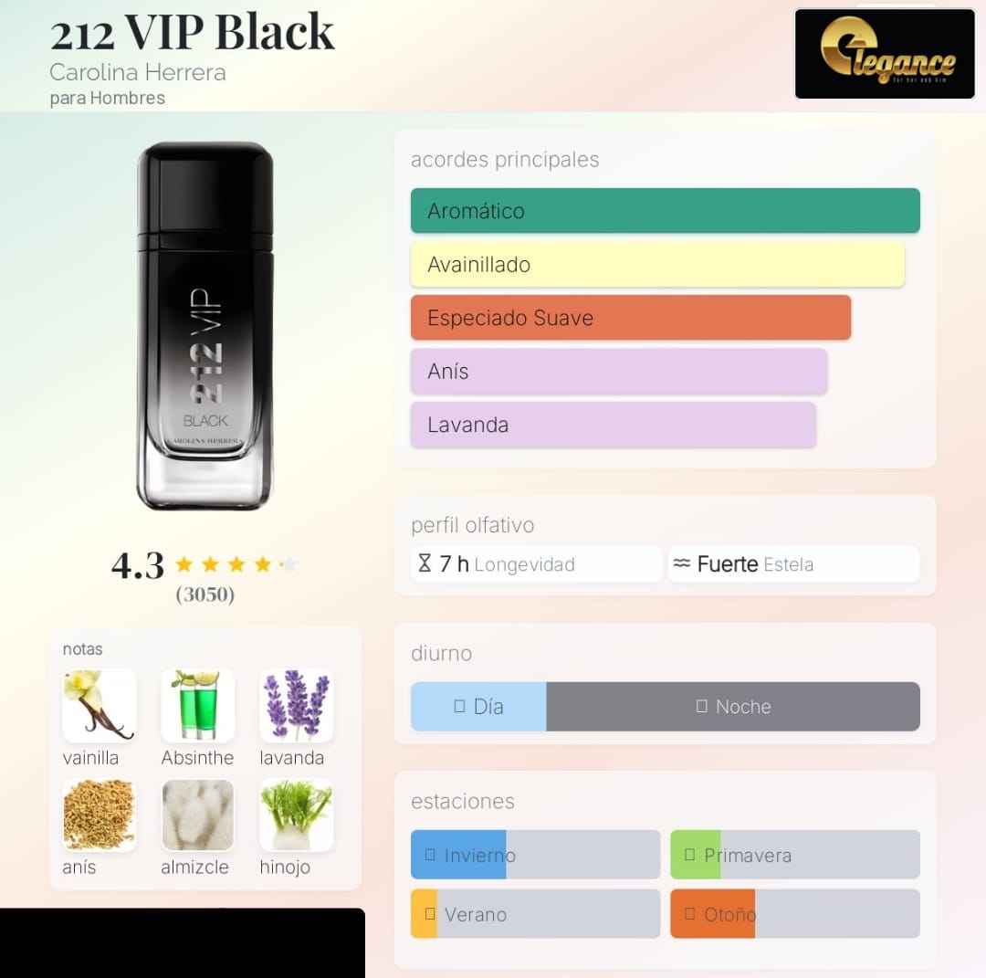 212 VIP Black de Carolina Herrera es una fragancia de la familia olfativa Aromática Fougère para Hombres. 212 VIP Black se lanzó en 2017. 212 VIP Black fue creada por Carlos Benaïm y Anne Flipo. Las Notas de Salida son absenta, anís y hinojo; la Nota de Corazón es lavanda; las Notas de Fondo son vaina de vainilla negra y almizcle.
