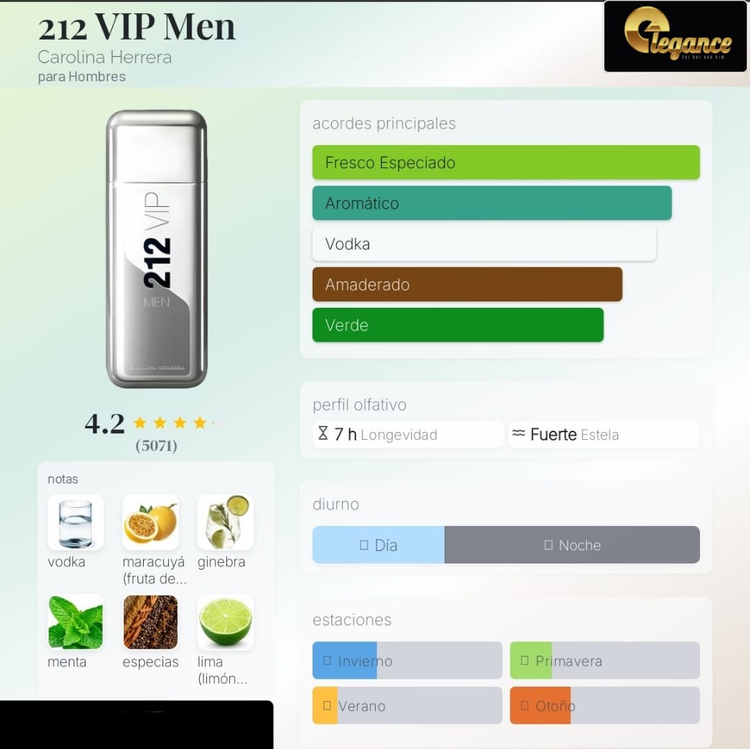 212 VIP Men de Carolina Herrera es una fragancia de la familia olfativa Oriental Amaderada para Hombres. 212 VIP Men se lanzó en 2011. 212 VIP Men fue creada por Emilie Coppermann y Lucas Sieuzac. Las Notas de Salida son maracuyá (fruta de la pasión), lima (limón verde), pimienta y jengibre; las Notas de Corazón son vodka, ginebra, menta y especias; las Notas de Fondo son ámbar, cuero y notas amaderadas.