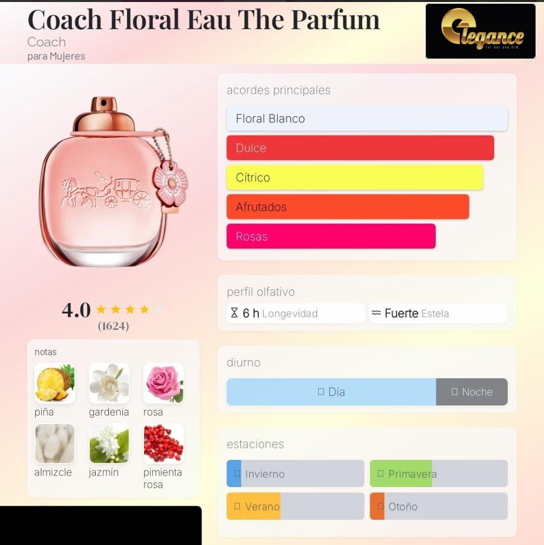 Coach Floral Eau The Parfum de Coach es una fragancia de la familia olfativa Almizcle Floral Amaderado para Mujeres. Coach Floral Eau The Parfum se lanzó en 2018. Coach Floral Eau The Parfum fue creada por Shyamala Maisondieu, Nadege le Garlantezec y Natalie Gracia-Cetto. Las Notas de Salida son piña, pimienta rosa, naranja, limón (lima ácida) y bergamota; las Notas de Corazón son gardenia, rosa de té, jazmín sambac (sampaguita) y hediona; las Notas de Fondo son almizcle, pachulí, notas amaderadas, vainilla y sándalo.