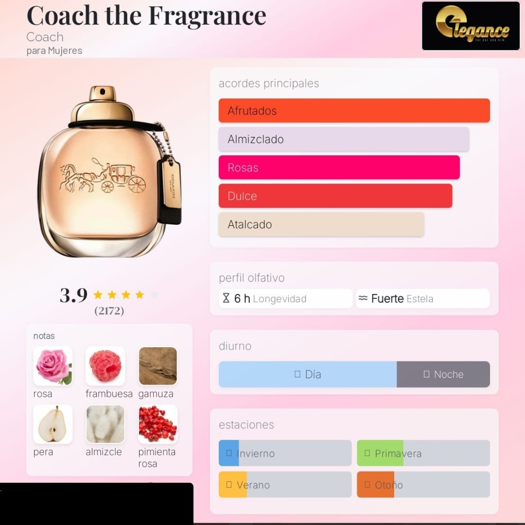 Coach the Fragrance de Coach es una fragancia de la familia olfativa Floral para Mujeres. Coach the Fragrance se lanzó en 2016. Coach the Fragrance fue creada por Juliette Karagueuzoglou y Anne Flipo. Las Notas de Salida son hojas de frambuesa, pera y pimienta rosa; las Notas de Corazón son rosa turca, gardenia y ciclamen (violeta persa); las Notas de Fondo son gamuza, almizcle, cachemira y sándalo.