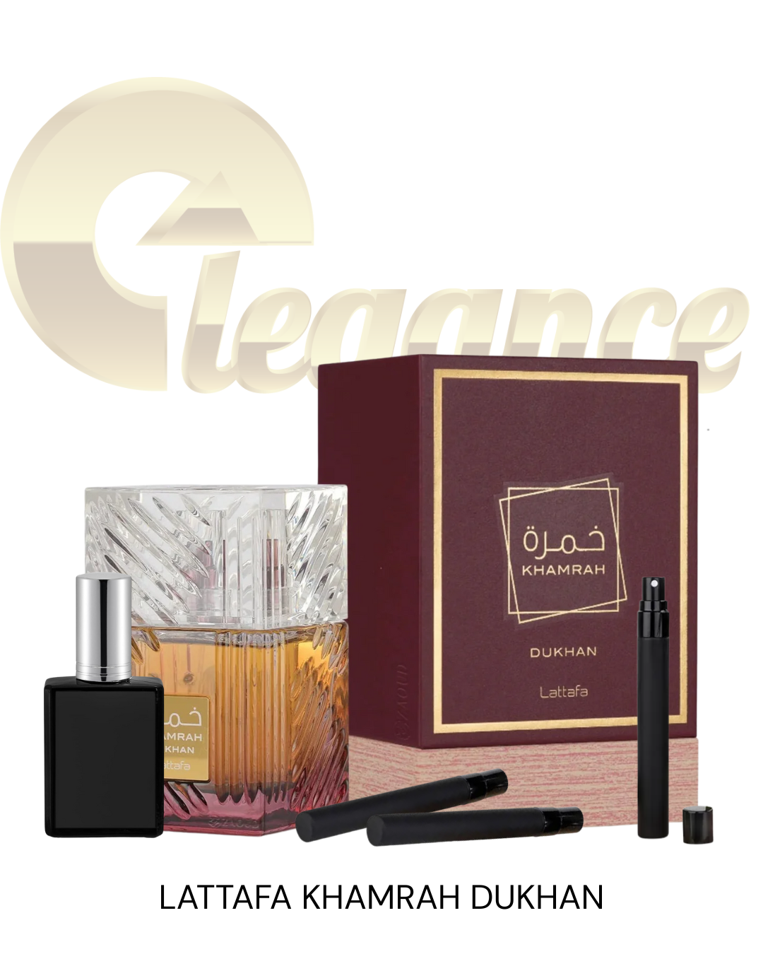 Khamrah Dukhan de Lattafa Perfumes es una fragancia de la familia olfativa Oriental para Hombres. Esta fragrancia es nueva. Khamrah Dukhan se lanzó en 2025. Las Notas de Salida son especias, pimiento morrón y mandarina; las Notas de Corazón son incienso, ládano, flor de azahar del naranjo y pachulí; las Notas de Fondo son tabaco, praliné, ámbar, haba tonka y benjuí.