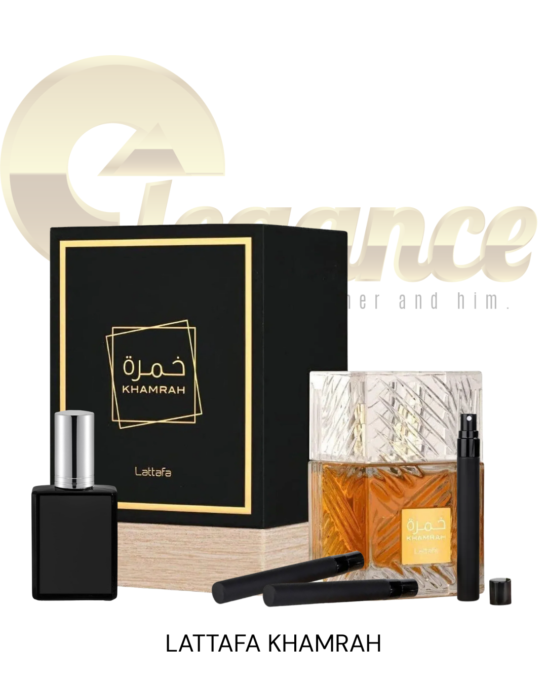 Khamrah de Lattafa Perfumes es una fragancia de la familia olfativa Oriental Especiada para Hombres y Mujeres. Khamrah se lanzó en 2022. Las Notas de Salida son canela, nuez moscada y bergamota; las Notas de Corazón son dátiles, praliné, nardos y Mahonial; las Notas de Fondo son vainilla, haba tonka, Amberwood, mirra, benjuí y Akigalawood.