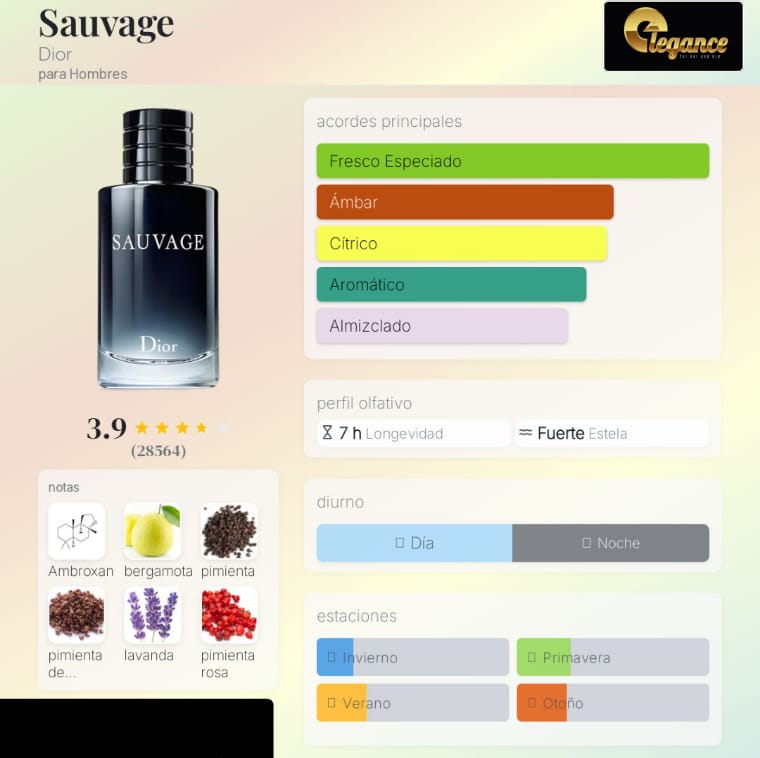 Sauvage de Dior es una fragancia de la familia olfativa Aromática Fougère para Hombres. Sauvage se lanzó en 2015. La Nariz detrás de esta fragrancia es François Demachy. Las Notas de Salida son bergamota de Calabria y pimienta; las Notas de Corazón son pimienta de Sichuan, lavanda, pimienta rosa, vetiver, pachulí, geranio y elemí; las Notas de Fondo son ambroxan, cedro y ládano.