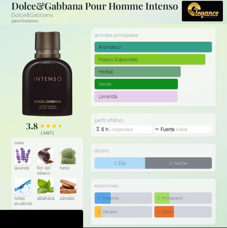 Dolce & Gabbana Pour Homme Intenso de Dolce&Gabbana es una fragancia amaderada aromática para hombre. Se lanzó en 2014. Sus notas de salida son lavanda, notas acuáticas, albahaca, geranio y caléndula; sus notas de corazón son tabaco, heno, esclarea, acorde de Moepel y salvado; sus notas de fondo son sándalo, ciprés, almizcle, ámbar y ládano.