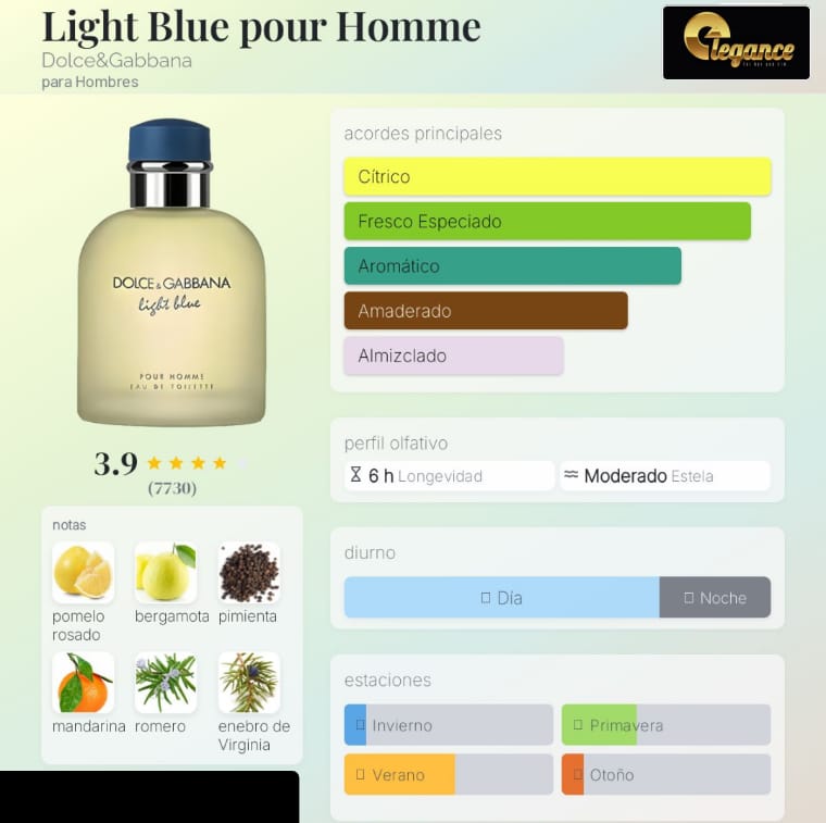Light Blue pour Homme de Dolce&Gabbana es una fragancia cítrica aromática para hombre. Light Blue pour Homme se lanzó en 2007. Sus notas de salida son pomelo, bergamota, mandarina siciliana y enebro; sus notas de corazón, pimienta, romero y palo de rosa de Brasil; y sus notas de fondo, almizcle, incienso y musgo de roble. Este perfume fue galardonado con el premio FiFi a la Fragancia del Año para Hombres de Lujo en 2008 .