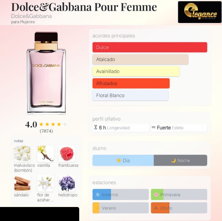 Dolce&Gabbana Pour Femme de Dolce&Gabbana es una fragancia floral para mujer. Se lanzó en 2012. Fue creada por Jean-Pierre Mary y Martine Pallix. Sus notas de salida son frambuesa, neroli y mandarina; sus notas de corazón, flor de azahar del naranjo y jazmín; y sus notas de fondo, malvavisco, vainilla, sándalo y heliotropo.
