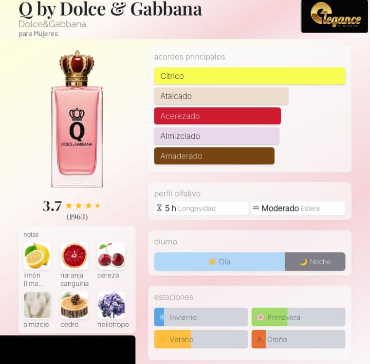 Q by Dolce & Gabbana de Dolce&Gabbana es una fragancia de la familia olfativa Aromática Frutal para Mujeres. Esta fragrancia es nueva. Q by Dolce & Gabbana se lanzó en 2023. La Nariz detrás de esta fragrancia es Daphné Bugey. Las Notas de Salida son limón siciliano (lima siciliana), naranja sanguina y jazmín; las Notas de Corazón son cereza y heliotropo; las Notas de Fondo son almizcle y cedro.