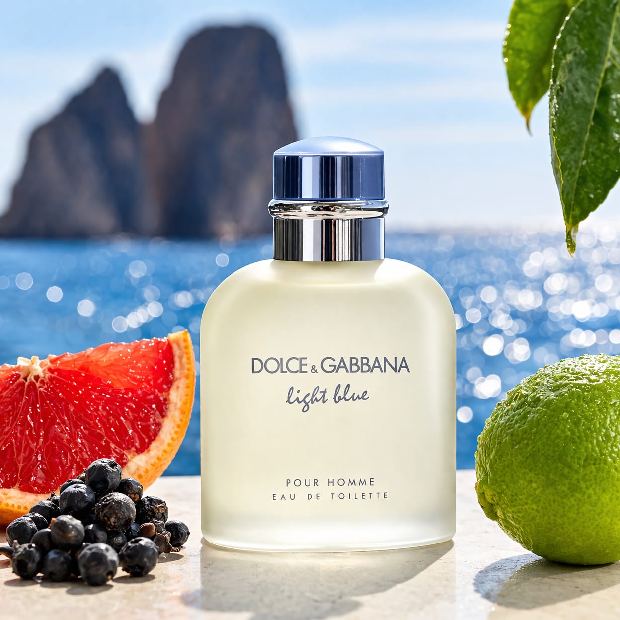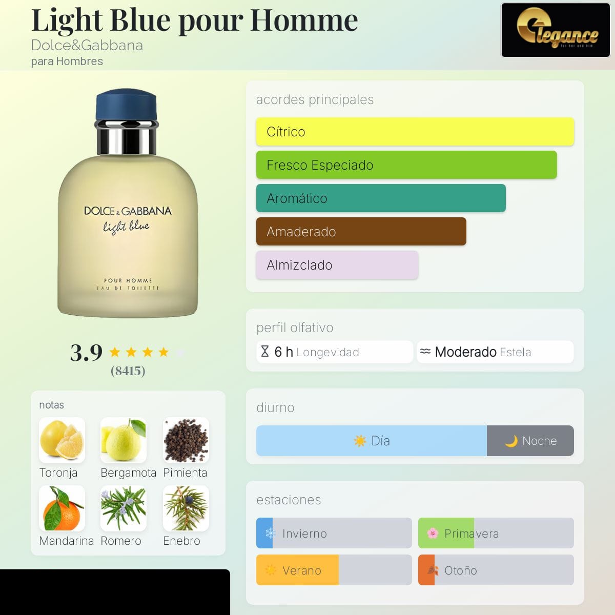 Light Blue pour Homme de Dolce&Gabbana es una fragancia de la familia olfativa Cítrica Aromática para Hombres. Light Blue pour Homme se lanzó en 2007. Las Notas de Salida son toronja (pomelo), bergamota, mandarina siciliana y enebro; las Notas de Corazón son pimienta, romero y palo de rosa de Brasil; las Notas de Fondo son almizcle, incienso y musgo de roble. Este perfume es el ganador del premio FiFi Award Fragrance Of The Year Men`s Luxe 2008.