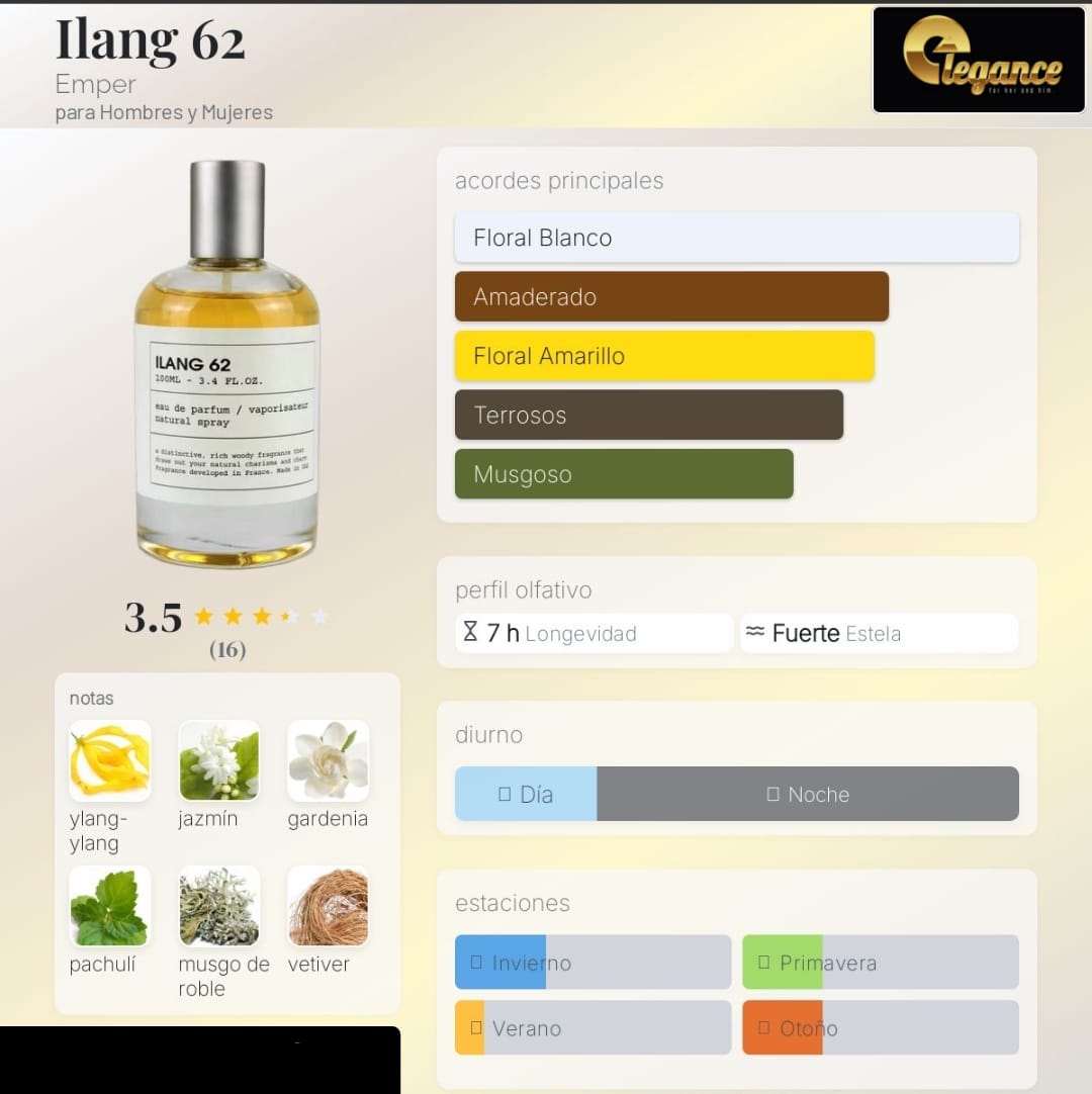 Ilang 62 de Emper es una fragancia de la familia olfativa Almizcle Floral Amaderado para Hombres y Mujeres. Esta fragrancia es nueva. Ilang 62 se lanzó en 2025. Las Notas de Salida son ylang-ylang, pachulí y musgo de roble; las Notas de Corazón son jazmín, tiaré de Tahití y vetiver; las Notas de Fondo son sándalo y benjuí.