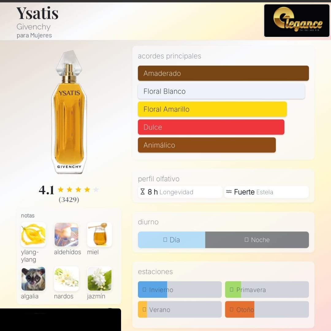 Ysatis de Givenchy es una fragancia de la familia olfativa Chipre Floral para Mujeres. Ysatis se lanzó en 1984. La Nariz detrás de esta fragrancia es Dominique Ropion. Las Notas de Salida son ylang-ylang, aldehídos, flor de azahar del naranjo, gálbano, palo de rosa de Brasil, coco, bergamota, mandarina y cítricos; las Notas de Corazón son nardos, jazmín, narciso, clavel, ron, iris y rosa; las Notas de Fondo son miel, algalia (civet), musgo de roble, sándalo, clavos de olor, ámbar, pachulí, almizcle, vetiver, laureles y vainilla.