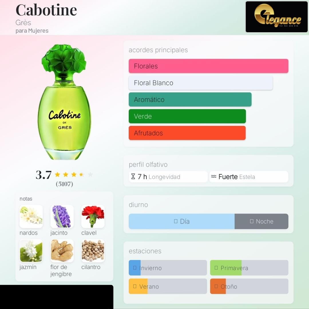 Cabotine de Grès es una fragancia de la familia olfativa Floral para Mujeres. Cabotine se lanzó en 1990. La Nariz detrás de esta fragrancia es Jean Claude Delville. Las Notas de Salida son cilantro, flor de azahar del naranjo, casia, grosellas negras, ciruela, durazno (melocotón) y naranja tangerina; las Notas de Corazón son nardos, jacinto, clavel, jazmín, jengibre, ylang-ylang, rosa, fresia, iris, heliotropo y violeta; las Notas de Fondo son algalia (civet), almizcle, grosellas negras, vetiver, sándalo, cedro, ámbar, haba tonka y vainilla.