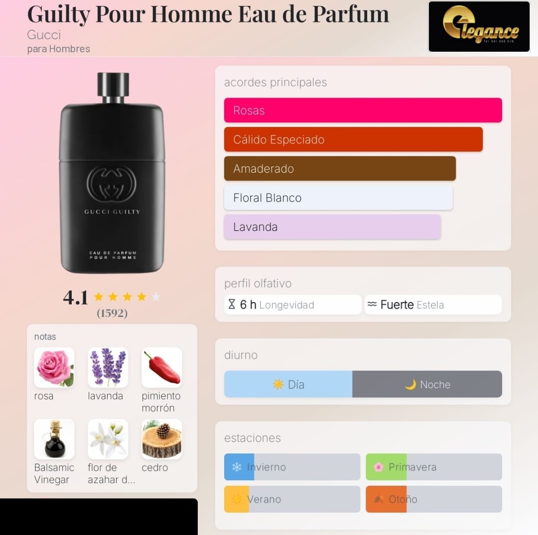 Guilty Pour Homme Eau de Parfum de Gucci es una fragancia de la familia olfativa Amaderada Especiada para Hombres. Guilty Pour Homme Eau de Parfum se lanzó en 2020. Las Notas de Salida son rosa, chile rojo (ají rojo), vinagre balsámico y sal; las Notas de Corazón son lavanda, flor de azahar del naranjo y neroli; las Notas de Fondo son cedro y pachulí.