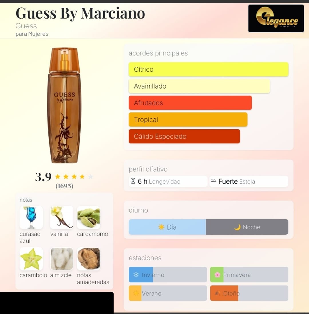 Guess By Marciano de Guess es una fragancia de la familia olfativa Floral Frutal para Mujeres. La Nariz detrás de esta fragrancia es Barbara Zoebelein. Las Notas de Salida son curasao, cardamomo, carambola y toronja (pomelo); las Notas de Corazón son madreselva, jazmín y peonía; las Notas de Fondo son vainilla, almizcle y notas amaderadas.