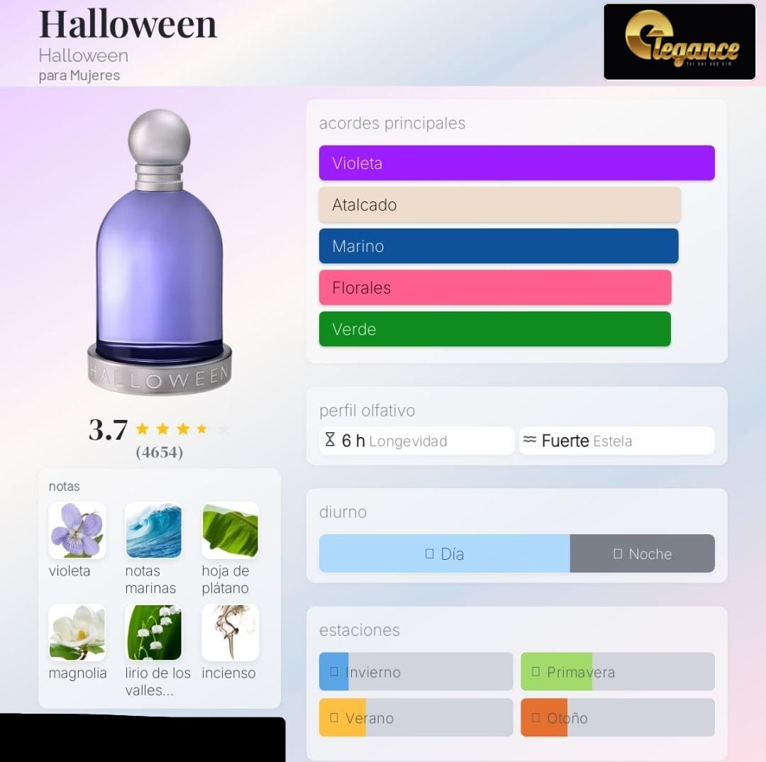 Halloween de Halloween es una fragancia de la familia olfativa Oriental Floral para Mujeres. Halloween se lanzó en 1997. La Nariz detrás de esta fragrancia es Max Gavarry. Las Notas de Salida son violeta, notas marinas, hoja de plátano y petit grain; las Notas de Corazón son violeta, magnolia, lirio de los valles (muguete), nardos y pimienta; las Notas de Fondo son incienso, sándalo, vainilla de Madagascar y mirra.
