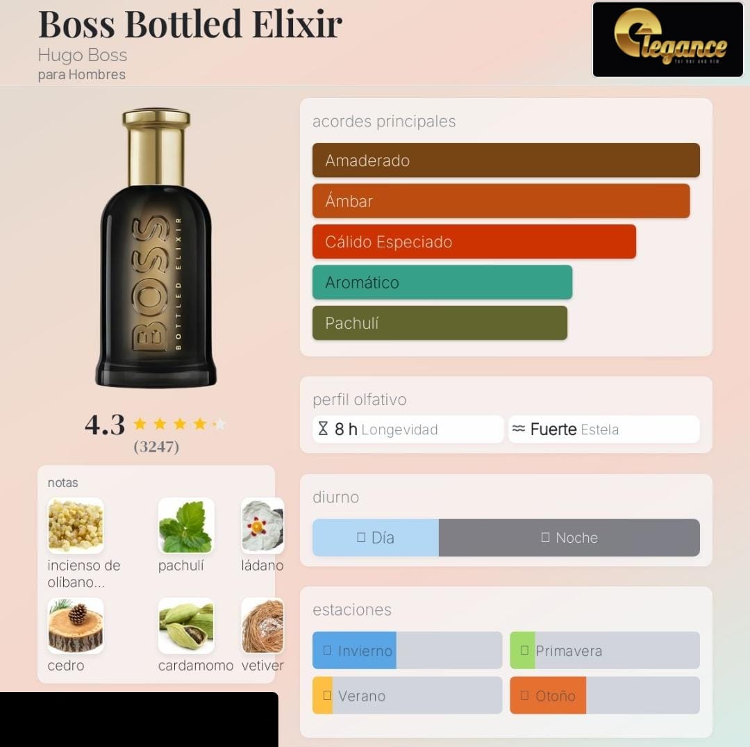 Boss Bottled Elixir de Hugo Boss es una fragancia de la familia olfativa Oriental Especiada para Hombres. Esta fragrancia es nueva. Boss Bottled Elixir se lanzó en 2023. Boss Bottled Elixir fue creada por Annick Menardo y Suzy Le Helley. Las Notas de Salida son Incienso y cardamomo; las Notas de Corazón son pachulí y vetiver; las Notas de Fondo son ládano y cedro.