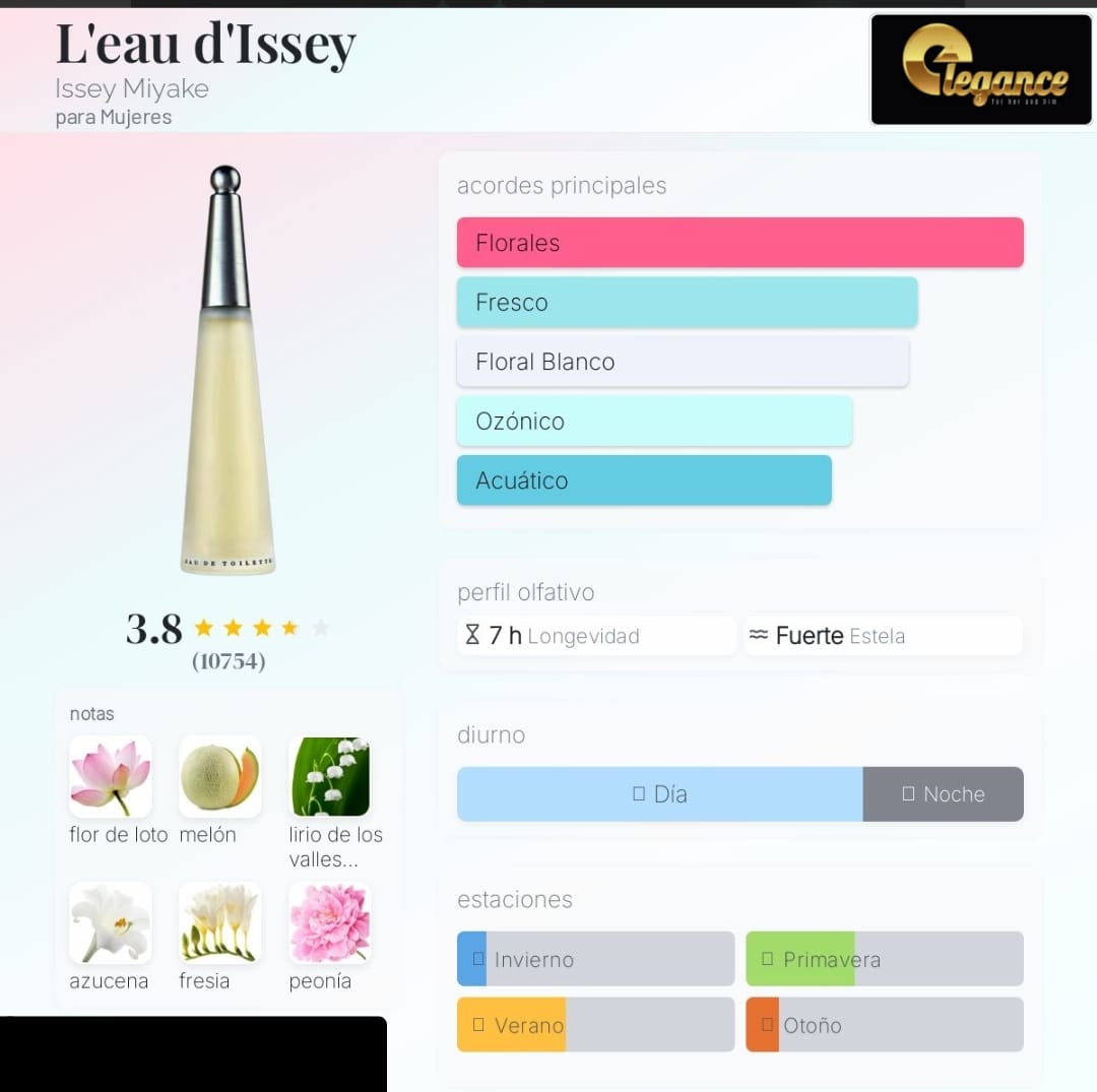 L’eau d’Issey de Issey Miyake es una fragancia de la familia olfativa Floral Acuática para Mujeres. L’eau d’Issey se lanzó en 1992. La Nariz detrás de esta fragrancia es Jacques Cavallier Belletrud. Las Notas de Salida son flor de loto, melón, fresia, agua de rosas, rosa, calone y ciclamen (violeta persa); las Notas de Corazón son lirio de los valles (muguete), azucena, peonía de agua y clavel; las Notas de Fondo son almizcle, nardos, maderas exóticas, osmanto (olivo oloroso), cedro, sándalo y ámbar.
