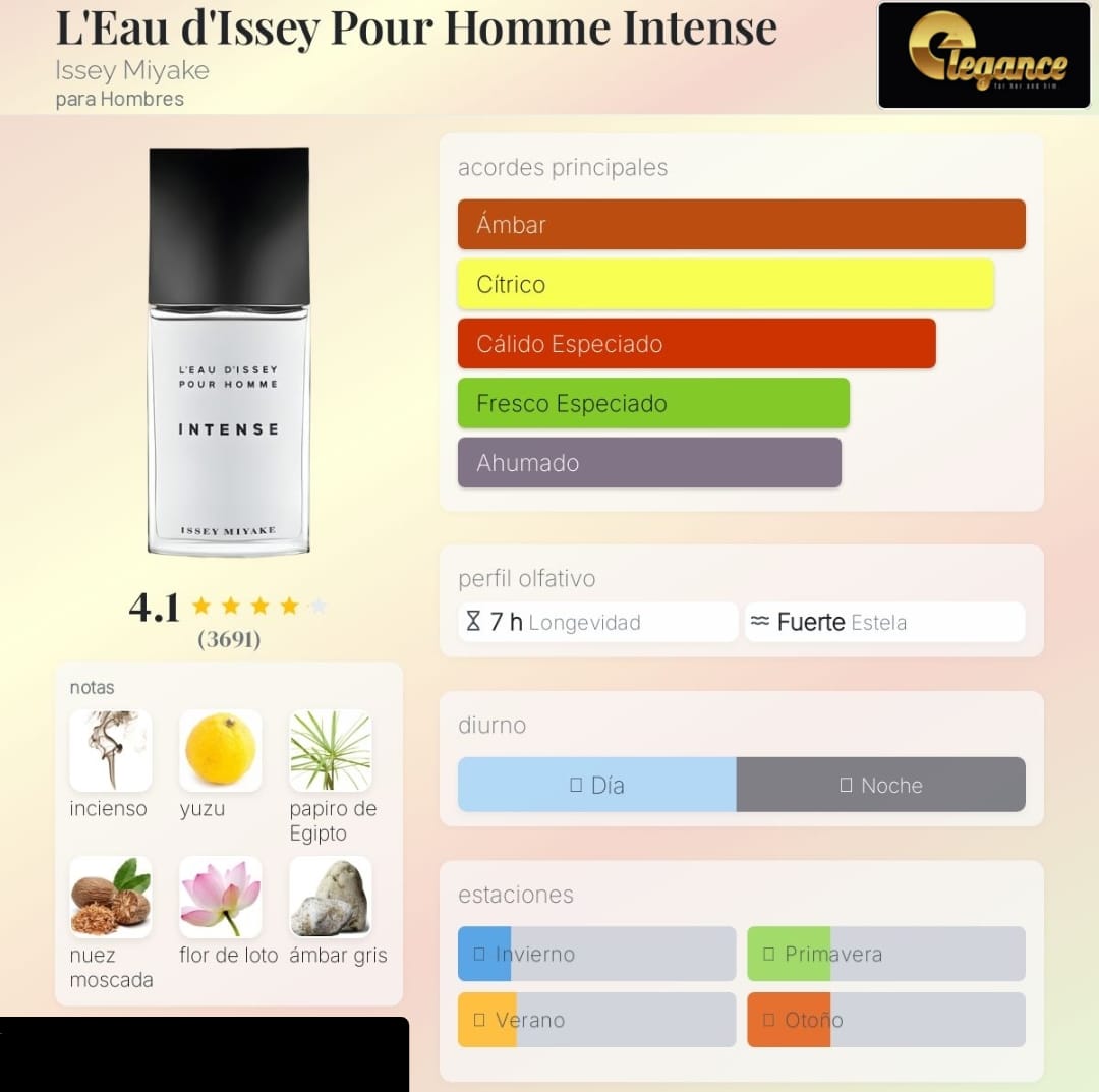 L’Eau d’Issey Pour Homme Intense de Issey Miyake es una fragancia de la familia olfativa Amaderada para Hombres. L’Eau d’Issey Pour Homme Intense se lanzó en 2007. La Nariz detrás de esta fragrancia es Jacques Cavallier Belletrud. Las Notas de Salida son yuzu, bergamota, naranja dulce y mandarina; las Notas de Corazón son nuez moscada, flor de loto, cardamomo, canela y azafrán; las Notas de Fondo son incienso, papiro de Egipto, ámbar gris, benjuí y ámbar.