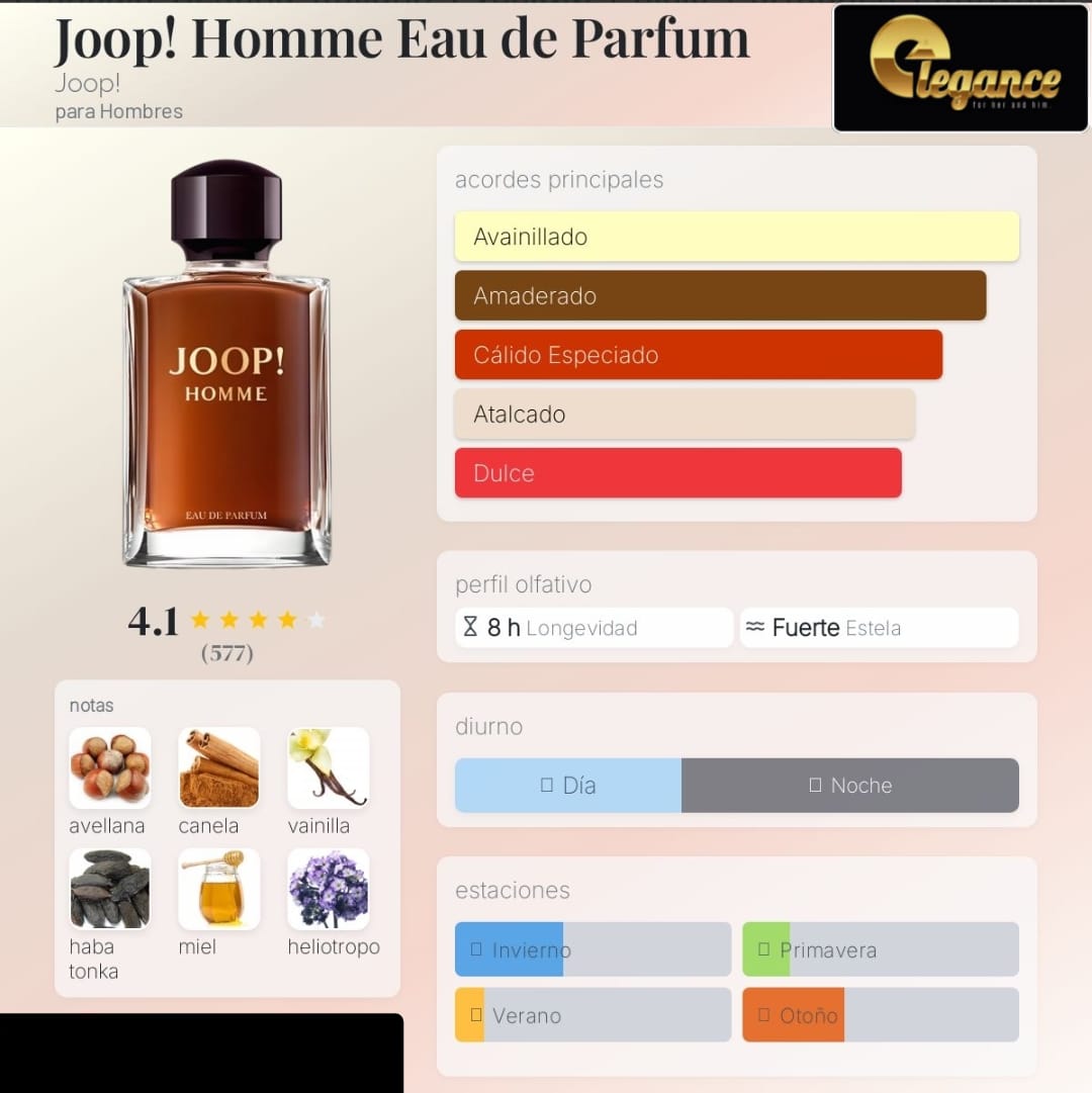 Joop! Homme Eau de Parfum de Joop! es una fragancia de la familia olfativa Oriental Vainilla para Hombres. Joop! Homme Eau de Parfum se lanzó en 2021. Las Notas de Salida son avellana, canela y bergamota; las Notas de Corazón son miel, heliotropo, flor de azahar del naranjo, cardamomo y abeto; las Notas de Fondo son vainilla, haba tonka, sándalo, cachemira, musgo y vetiver.