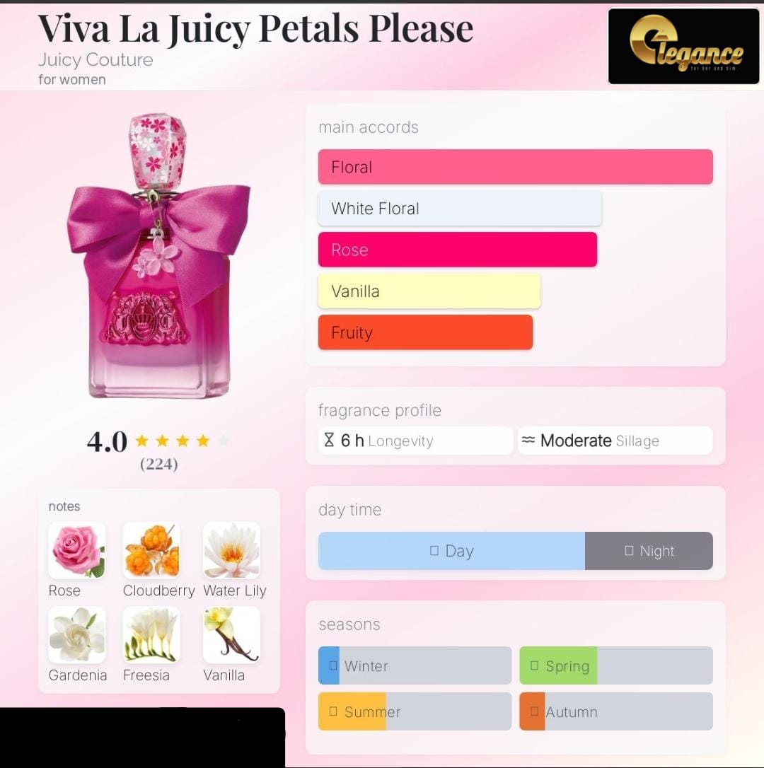 Viva La Juicy Petals Please de Juicy Couture es una fragancia de la familia olfativa Floral Frutal Gourmand para Mujeres. Viva La Juicy Petals Please se lanzó en 2022. Las Notas de Salida son Camemoro, nenúfar (lirio de agua) y magnolia; las Notas de Corazón son agua de rosas, gardenia, fresia rosa y jazmín egipcio; las Notas de Fondo son vainilla de Madagascar, caramelo, ámbar, notas amaderadas y sal.