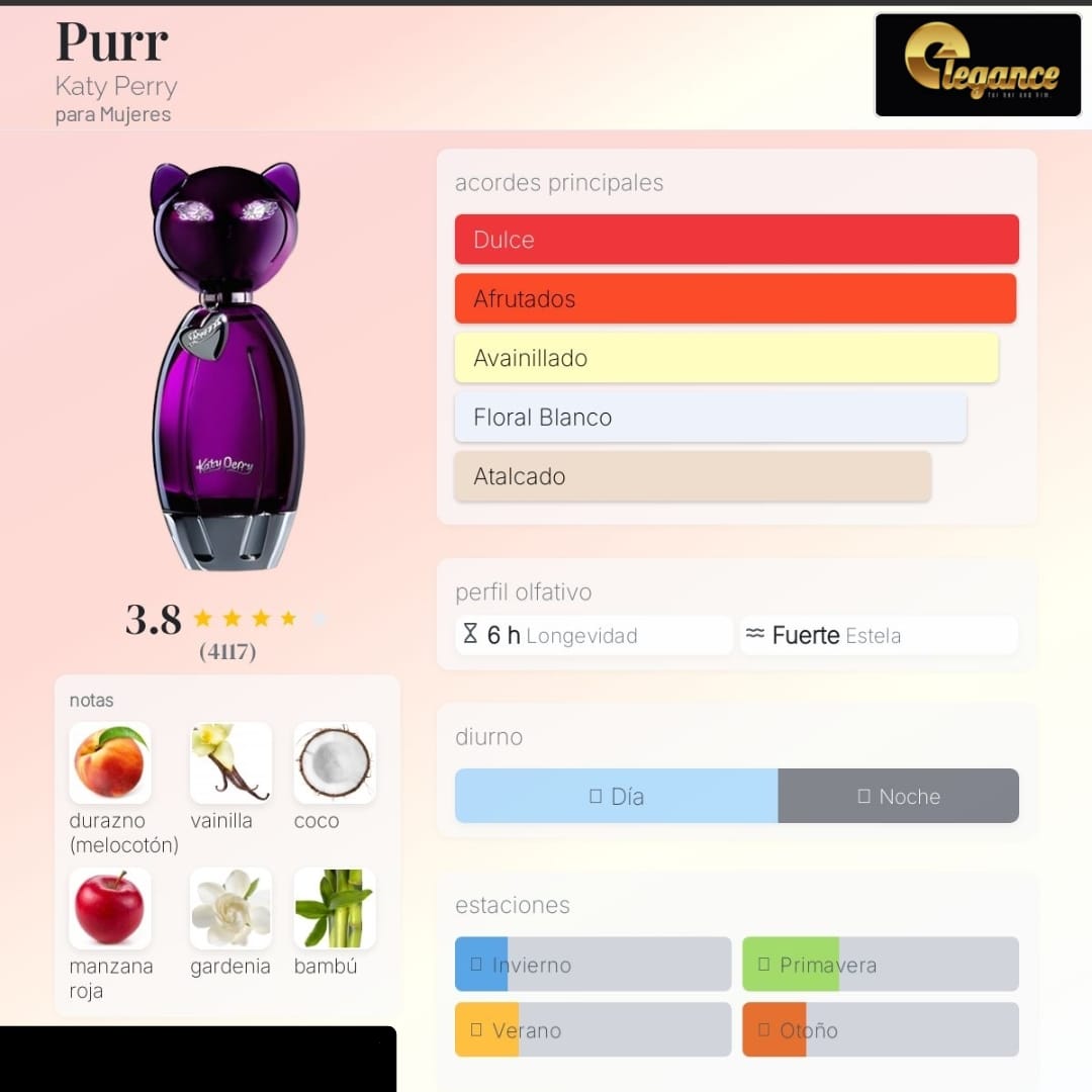 Purr de Katy Perry es una fragancia de la familia olfativa Floral Frutal para Mujeres. Purr se lanzó en 2010. Las Notas de Salida son durazno (melocotón), manzana roja, gardenia y bambú; las Notas de Corazón son jazmín, fresia y rosa; las Notas de Fondo son vainilla, coco, orquídea, almizcle, ámbar y sándalo.