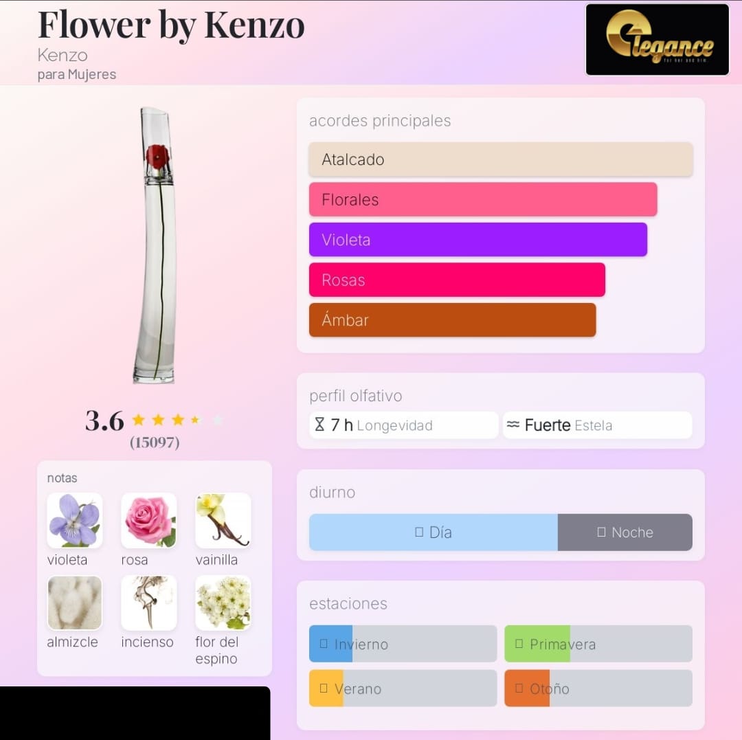 Flower by Kenzo de Kenzo es una fragancia de la familia olfativa Oriental Floral para Mujeres. Flower by Kenzo se lanzó en 2000. Flower by Kenzo fue creada por Alberto Morillas y Christian Dussoulier. Las Notas de Salida son rosa de Bulgaria (rosa Damascena de Bulgaria), flor del espino, grosellas negras y mandarina; las Notas de Corazón son violeta de Parma, rosa, opopónaco y jazmín; las Notas de Fondo son vainilla, almizcle blanco y incienso.