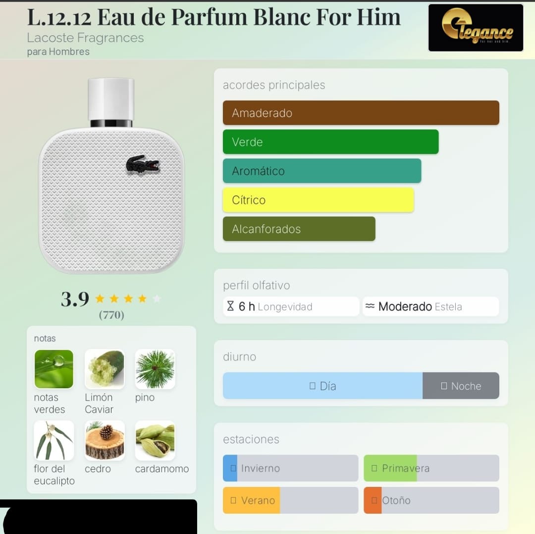 L.12.12 Eau de Parfum Blanc For Him de Lacoste Fragrances es una fragancia de la familia olfativa Amaderada Aromática para Hombres. L.12.12 Eau de Parfum Blanc For Him se lanzó en 2021. L.12.12 Eau de Parfum Blanc For Him fue creada por Marie Salamagne y Ane Ayo. Las Notas de Salida son notas verdes y Limón Caviar; las Notas de Corazón son eucalipto y cardamomo; las Notas de Fondo son pino y cedro.